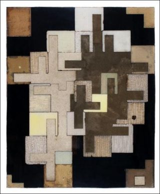 Avec les «Courtyards», collages géométriques recouverts de résine polie, Clay Ketter réaffirme sa volonté de construire la platitude au lieu de la peindre. Comme sur un plan, on y distingue des surfaces libres entre des blocs ressemblant à des groupements de bâtiments.