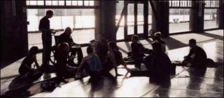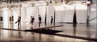 Derrière les baies vitrées de l’ancienne usine d’assemblage Ford à Richmond, où la compagnie Merce Cunningham répètera pendant trois jours, un oiseau prend son envol. L’océan absorbe les premiers rayons du soleil matinal. Les dockers commencent leurs activités journalières. A l’intérieur du bâtiment de verre et d’acier, construit par Albert Kahn en 1930, la lumière vient bouleverser la topographie du sol encore luisant d’eau, fraîchement nettoyé pour y accueillir la danse. Reflets, silhouettes en contre-jours, conciliabules…