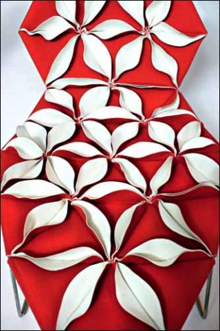 Cette même sensibilité se retrouve dans l’utilisation des nouvelles technologies, qui sont l’occasion d’un décor joyeux et débridé. En témoignent cette Digitable en métal perforé numériquement, ou ce fauteuil Antibodi édité par Moroso, dont le motif de pétales cousus en feutre et drap de laine, légèrement rembourré, participe à la fois au confort et à l’impact visuel de l’objet.