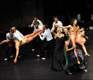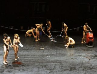 Des danseurs à vue sur une scène ouverte dès l’entrée des spectateurs, déjà fait par le même. Des corps dénudés, oui. Des courses, des cris, oui mais encore? Des interpellations du public — ici plus légère —, une seule en fait, fort «chorégraphiée» (il s’agissait de pénétrer avec les doigts tous les orifices de Cindy, innocente poupée en plastique qui finit violée par le courageux — et consentant? — spectateur venu se jeter à l’eau et sur lequel toute la troupe faillit passer avant de se rabattre sur la plastique Cindy).