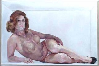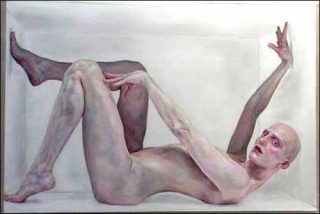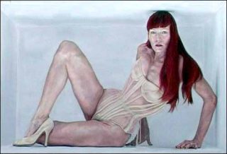 La toile de Renson forme cette boîte. A l’intérieur, les personnages représentés en taille réelle essayent de s’y faire une place, s’adaptant à la pauvreté de l’espace. Certains en jouent avec bonheur, tentant des pauses sensuelles ou délicates. D’autres perdent leurs repères et livrent une fragilité grave qui nous renvoie brutalement à notre situation de voyeur.