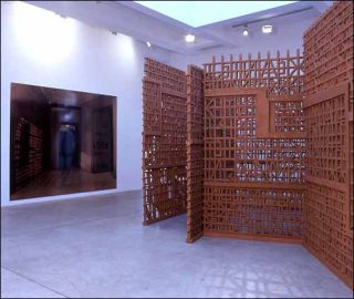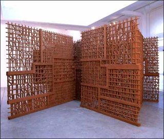 — Untitled (Jalousie VI), 2002. Bois, résine, poudre de cuivre. 680 x 550 x 260 cm.