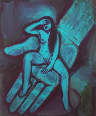 Le tableau intitulé Fenouil en son fief de Guillaume Pinard présente un petit corps de forme humaine surmonté d’une énorme tête qui n’est rien d’autre qu’un fenouil doté d’yeux et d’une bouche. Ce personnage, aussi drôle qu’attendrissant, pose devant un paysage de montagnes rouges. Sur le tableau tout en tons de bleu La petite pause, une main tendue expose dans sa paume ouverte une femme nue assise.