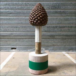 La série de scuptures Lebayou de Jacques Julien brandit divers objets au bout de petits poteaux plantés dans un socle. Ici, une pomme de pin est posée au sommet d’un mince poteau en bois partiellement entouré de tissu et maintenu vertical par un socle rond en pierre. Ailleurs, un simple bâton irrégulier sert de tige à un morceau de la même matière découpé selon une vague forme de papillon et décoré de pois blancs, le tout étant planté dans une matière blanche au milieu d’un pneu.