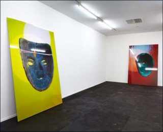 Dans la même pièce mais isolée par un mur, deux grandes photographies au fond jeune vif et rouge sang représentent des masques anciens très simples, en bois, retournés. Parodie d’une véritable campagne de pub mexicaine des années 1980, qui utilisait ces objets de collection pour vendre des neuroleptiques, la série « Umriss » renvoie dos-à -dos le travail de conservation, voire le devoir de mémoire, et la réappropriation de cette histoire par l’industrie.