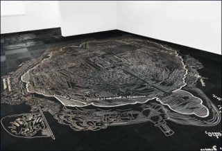 L’œuvre introductive, Nuremberg Map of Tenotchtilan, impressionnante par sa taille, recouvre tout le sol de la première salle à l’étage. Elle se présente comme un parquet composé de plaques d’un bois très sombre, semblable à l’ardoise, et sur lesquelles est gravée la carte sommaire d’une ville. Avec un peu de recul, et au fil d’un cheminement à travers l’espace, le dessin se découvre comme la reproduction agrandie d’un plan de Tenochitlan, ancien nom de Mexico. Brossée à grands traits, la ville est cependant clairement reconnaissable. On peut distinguer ses bâtiments, son centre-ville, la présence de cours d’eau, jusqu’au golfe du Mexique, ou des zones signalées comme étant habitées par des animaux. Référence à une carte ayant réellement existé, la première de la ville connue après la Conquista, elle fut envoyée par Hernan Cortés au roi d’Espagne, l’informant de la topologie de ce nouvel espace à annexer.