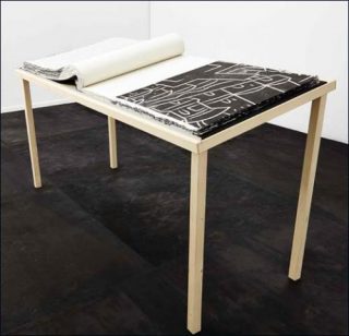 L’Atlas qui lui est associé, énorme livre constitué par les imprimés de chaque plaque de bois de la première œuvre, insiste davantage sur la possibilité de lire cette transcription idéologique, politique et faussement géographique, comme une narration cousue de toutes pièces. On comprend vite que l’œuvre au sol a servi de matrice au livre, les plaques ayant été utilisées pour l’impression de L’Atlas. Isolée de l’ensemble cartographique, chaque parcelle en soi ne dit plus rien de réellement signifiant, elle découvre surtout des motifs abstraits qui rendent plus sensible la facture graphique du dessin initial, tout en le rattachant anachroniquement à une façon plus moderne de penser l’art graphique.
