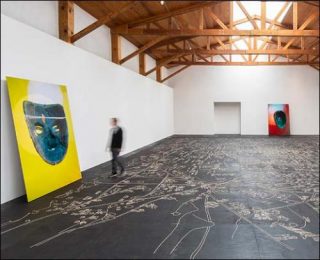 Le motif gravé du sol de Nuremberg Map of Tenochtitlan (2013) est aussi pensé comme une matrice, à partir de laquelle des impressions de chacune des plaques ont été réalisées sur papier, donnant au bois du sol sa teinte sombre par le biais du processus d’impression. L’œuvre Atlas (2014), issue de ce processus, est un livre de très grande dimension dont les pages nous livrent sous l’angle du fragment la carte et les narrations qu’elles contiennent montrant deux grands masques de bois coloré, vus de dos, à l’aspect anthropomorphique dérangeant. Ces photos sont inspirées d’une publicité mexicaine des années 1980 pour un antidépresseur que l’artiste a recomposé en utilisant des masques du Musée ethnographique de Berlin. L’artiste effectue ici un commentaire malicieux bien que tragique sur la mélancolie inhérente à nos temps post-coloniaux.