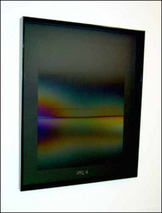 Cinq cubes de verre posés sur des socles en plexiglas sont disposés dans l’espace de la galerie. Leur apparente sobriété est immédiatement court-circuitée par la coloration irisée de leur surface. Contrebalançant la sévérité de la forme, elle introduit une labilité de l’expérience sensible qui contraste avec l’exigence de clarté formelle poursuivie par le minimalisme.