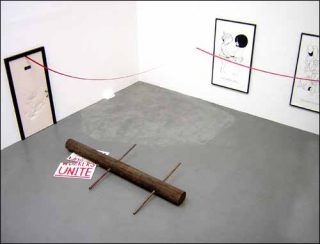 — From My Institution to Yours, 1987-2003. Acrylique sur panneau de bois et sur papier, tapis, ruban, bois, acier et aluminium. 41 x 465 x 310 cm.