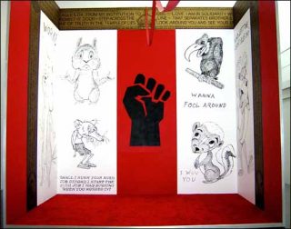 Toutefois, depuis les années 1980, le territoire d’investigation de Mike Kelley est-il resté identique ? Vingt ans ont passé depuis l’émergence des premières œuvres critiques de l’artiste. L’Amérique n’a-t-elle pas changé de visage depuis ? Le vocabulaire de Mike Kelley demeure stable, et l’effet de rupture des « événements du 11 septembre » ne semble pas avoir été enregistré par son sismographe pourtant extrêmement sensible. L’exposition installée chez Ghislaine Hussenot met en place, au milieu de « Comic Drawings », l’opposition entre une grève de camionneurs et le bureau emblématique des cols-blancs. De part et d’autre des inégalités, la même culture populaire infantile règne, que ce soit dans les affichages militants ou au-dessus des bureaux. Mais rien d’inédit n’est repérable, qui désignerait plus précisément cette nouvelle Amérique contemporaine dont nous entendons parler dans nos journaux. Comment interpréter ce statisme dans la saisie, cette immobilité dans l’enregistrement ?