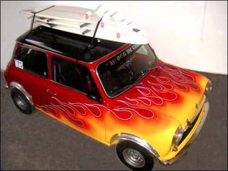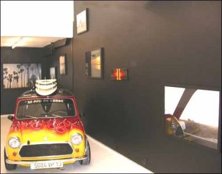 — Mini Surf car, 2004. Austin Mini 1971, planches de surf, peinture de carrosserie, poste laser, amplificateur, 13 CD, magazines et vêtements. 130 x 310 x 150 cm.