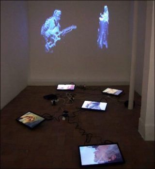 — Gary Hill, Depth Charge, 2009-2012. 1 vidéoprojecteur HD, 5 écrans LCD de 53 cm, 6 lecteurs multimédia, 6 fichiers audio-vidéo, 1 ampli multicanal (DIY), 5 haut-parleurs nus de 7,5 cm, 1 ampli stéréo, 2 haut-parleurs hi-fi, câbles, prolongateurs, adaptateurs, 400 µg de LSD-25