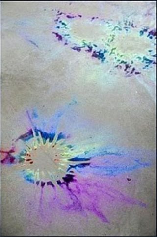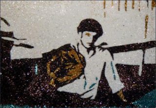 Fanette Muxart pose ses valises à OUI le temps d’une exposition. Hôtesse de l’air sur la compagnie de ses désirs, elle voyage de vie en vie pour chacun de ses projets, fantasmant d’autres existences plus glossy peut-être, plus pearly souvent. Elle imagine un Las Vegas de pacotille pour l’exposition «L.V» où les diamants ne brillent plus, figés sous la peinture à l’huile, où les lettres d’or des enseignes lumineuses sont réduites à de petits bibelots scintillant mollement, où même la voix d’Elvis s’est enrayée sous la poussière. Chercheuse d’or pour l’installation Le Parterre de Papier-Cadeaux Sans que le Plafond soit Jaloux, elle joue aussi les Mécano pour sa résidence à Véranda, bleu de travail recouvert de paillettes et caisse à outils débordant de strass. Pour «D.C.», OUI est un garage fantôme et retrouve ses taches d’essences sur le sol, éphémères cette fois puisque la force d’un simple souffle les disperse. L’espace est habité par une présence, celle des chambres de motel vides, celle des déserts où l’horizon ondule sous l’effet de la chaleur, celle des manèges fatigués à l’aube quand la fête est finie, celle des papiers cadeaux qui jonchent le sol les lendemains de Noël, …