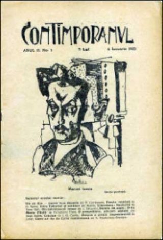 —  Contimporanul, volume 2, nº 1, 6 janv. 1923, Bucarest. En couverture autoportrait de Marcel Janco. Contimporanul, publiée à Bucarest entre 1922 et 1932 éditée par Ion Vinea, fut une des plus importantes revues d’avant-garde en Europe centrale.