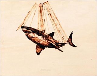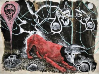 Damien Deroubaix. Cela ne change pas ma pratique mais cela enrichit et apporte un nouvel élément qui va pousser plus loin les autres… J’ai toujours fait de la gravure mais quand j’ai pu faire de grandes gravures sur bois que j’imprimais, j’ai trouvé de nouvelles solutions qui se sont reportées dans mes peintures. Par ailleurs, j’ai collé dans mes peintures une partie des gravures imprimées. Cela a apporté de nouveaux mots à mon vocabulaire. La gravure sur verre m’a amené à changer d’autres choses, par exemple maintenant je dessine au crayon, c’est lié à mon travail sur le verre.