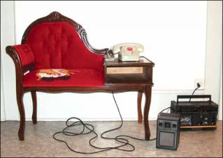 — Canapé d’or, 2005. Patchwork, tissus, velours et broderies. Téléphone vintage avec installation sonore. 94,5 x 86,5 x 44 cm.