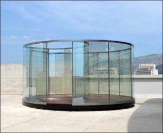 Indissociable des pavillons, le verre semi-réfléchissant (two-way mirror) évoque les immeubles de bureau construits depuis les années 1970, permettant à la lumière d’entrer dans l’édifice tout en garantissant sa confidentialité. Au delà des multiples jeux de reflets/réflexions, ce type de verre nous fait également prendre conscience du passé immédiat, notion clé dans le travail de Dan Graham, héritée de Walter Benjamin et explorée dès le début des années 1970 au travers de ses dispositifs vidéo-performatifs.