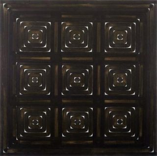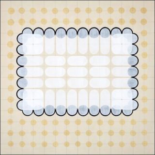 Six grandes toiles de même format sont étrangement accrochées près du sol. Le corps du spectateur fait l’expérience de ces compositions spatiales attirées vers la terre comme par une gravité qui témoignerait du poids conséquent de l’objet. Et pourtant, ces assemblages de motifs géométriques se caractérisent par une légèreté, dans la forme comme dans la technique.