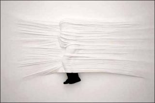 Playground toutefois laisse la place à un univers plus souriant, moins sombre que la précédente exposition. Le caché a toujours la part belle. La reconstruction semble toujours occuper ses pensées, mais le tout se fait sur un autre mode plus amusé. Salle de théâtre blanche, agora zen, ces corps tombants et légers aèrent sa production. L’aérien est à l’honneur, l’icarisme est convoqué.