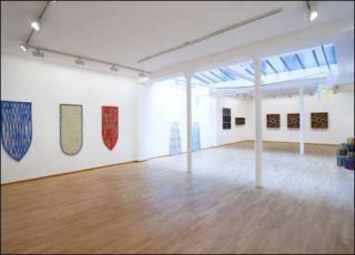 Un polyptique de neuf écussons — trois emblèmes posés sur trois niveaux — intitulé Blasons, aux motifs de papier peint donne d’emblée le ton. Les emblèmes des boucliers de petite dimension, peints des couleurs les plus variées (bleu, vert, mauve, orange) sont marouflés sur bois. Divers agencements de cloutages argentés — en forme de flèche, de losange, de croix — ornent les panonceaux. Chaque blason porte le blaze d’une famille, d’une lignée princière ou royale ou, plus prosaïquement, d’une corporation. L’artiste propose des armoiries fictives qui, en même temps, ont l’air tout ce qu’il y a de plausibles.