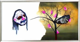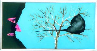 Cependant l’étonnante et séduisante peinture sous verre réserve aussi une amertume des représentations ou de la touche qui évite ainsi une onctuosité inopportune: l’inquiétante fixité des yeux et des bouches ou le détourage vibrant des oreilles, leur couleur rose, les lignes sinueuses et tendues des branches, l’isolement des morceaux dans la surface, rappellent à la fois Jérôme Bosch, la dureté d’une figuration néo-expressionniste (Immendorf ou même Garouste), la violence de Grünewald. La cristallisation des formes garde un peu encore le souvenir des premières icônes peintes.