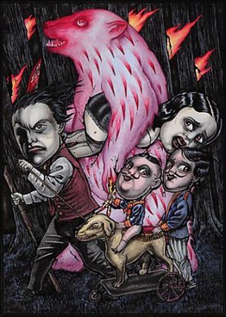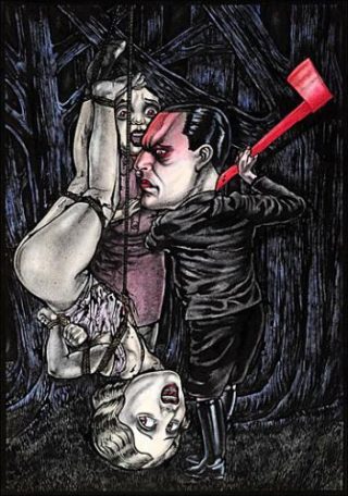 Antoine Bernhart peint des scènes de crimes sexuels transposés dans un théâtre de la cruauté. S’y actent des visions obscènes et sadiques. Métamorphosées en corps machines, les victimes comme les bourreaux s’y définissent comme les principes dynamiques d’expérimentations masturbatoires. La scène esthétique est très fréquemment celle de la forêt: le sanctuaire de la déesse nature, abritant des animaux féroces et recelant des puissances magiques. Forêt dense, sombre où peut se conter la fulgurance du désir dans l’exacerbation de la peur. Le panthéisme renouvelé d’Antoine Bernhart s’alimente d’une libido inassouvie dont la force procède de la négation même du fantasme en son acception usuelle.