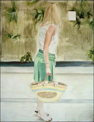 De même, lorsque la jeune femme, vêtue d’une robe grise, chaussée de derby bicolores comme ceux de Fred Astaire, les genoux en dedans, est décadrée et qu’il est de toute manière impossible de l’identifier, le peintre trouve tout de même le moyen de caser son motif qui a la taille (et la fonction contraire) d’un badge.