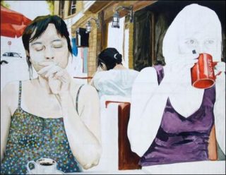 Nous avons été sensible, par ailleurs, au grand format horizontal présentant deux jeunes femmes en train de petit-déjeuner à la terrasse d’un café. Celle de gauche a les yeux fermés, absorbée par la dégustation de sa viennoiserie. Celle de droite a les yeux fixés sur l’horizon lointain et hors champ; elle tient à la main un mug à la gloire d’une multinationale suisse spécialiste ès ersatz. Ici, on n’a pas droit au rectangle de rigueur. C’est le visage en son entier de la jeune fille qui est blanc, vierge, livide, comme celui d’une morte.