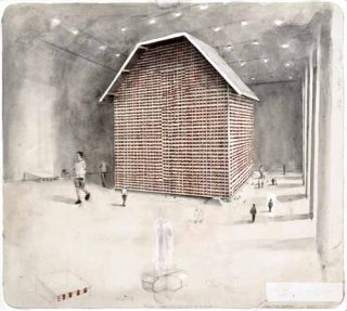 Quant aux dessins, de petits formats, parfois exécutés sur des supports particuliers, comme des couvercles de boîte, ils figurent de façon itérative une architecture qui lie l’infiniment grand avec l’infiniment petit : une maison plutôt banale aux très nombreuses fenêtres, comme amplifiée, qui ressemble à un jeu d’enfant, à une maquette ou à une architecture monumentale. Des personnages minuscules sont dans sa proximité ; d’autres, plus grands, les côtoient ou bien encore la maison est perçue comme maquette. Jeux d’échelle, de mises en scène étranges, de mise en abyme, chorégraphies de corps lilliputiens distribués dans l’espace des petits formats des supports, l’œuvre dans son ensemble développe toute une géométrie dont la logique reste secrète, la géométrie d’une énigme poétique.