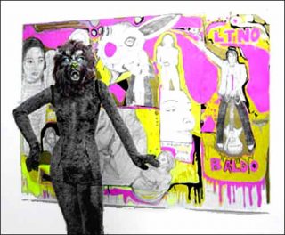 — Hurricane, 2005. Wall-painting, sculpture, peinture, encre de chine, papier, drap. 300×200 cm.