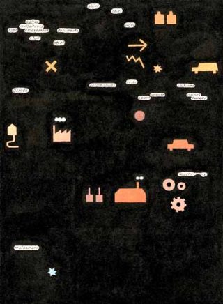 La notion de contrainte, dans la veine de l’OuBaPo (dérivé de l’OuLiPo adapté à la bande dessinée), est encore plus présente dans TNT en Amérique. Utilisée comme matière première à ce travail, la bande dessinée Tintin en Amérique, d’Hergé, est détournée par Jochen Gerner qui noircit les planches en gardant juste quelques mots du texte original et en ajoutant des éléments graphiques colorés.