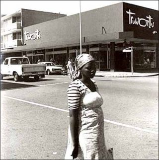 En 1975, la neutralité du format carré découpait des fragments de corps au repos. Mains usées, pieds nus, vêtements élimés, blouses et salopettes tachées, postures ramassées, et corps las y côtoient l’indifférence, et le lent vieillissement des blancs, identifiables aux attributs petit-bourgeois de la mode occidentale des années 70 — pattes d’éph’ et semelles compensées, sacs à main en cuir vernis pour les dames en noir. Mais le déploiement de ces détails, happés au bord de l’intime, excède le seul témoignage contre l’injustice sociale et raciale de l’époque. C’est l’enfermement sans perspective d’une société recluse et immobile, qui émane de cet assemblage, sans horizon ni regard.