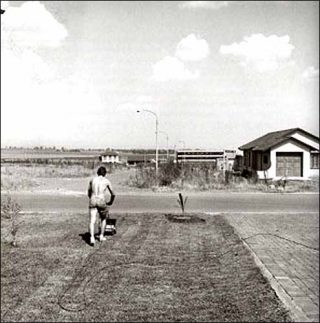 Désormais libre de tout protocole, indifféremment en couleur ou en noir et blanc, David Goldblatt traque à nouveau les indices qui inscrivent, dans la ville et le paysage, de façon à peine perceptible parfois, l’injustice et la misère. Ainsi, sur un coin de terre ingrate et sèche, ces lotissements pour noirs inachevés. Ailleurs des bidonvilles entre prairie herbeuse et voie rapide, ou d’autres, plaqués contre des HLM comme à une fortification, devant lesquels sèche du linge à l’improbable blancheur immaculée.