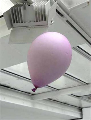 Des ballons se suspendent aux poutres de la galerie. Ce n’est pas leur légèreté qui les a délivrés des lois de l’apesanteur. A moitié déchirés, ils montrent leur intérieur de mousse qui a permis de les accrocher au plafond. L’artiste apprenti sorcier a préféré révéler, dans un auto-sabordage désespéré, ses tours de passe-passe illusionnistes.