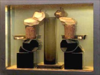 Des restes hétéroclites de la vie quotidienne, des animaux, des plantes sont exposés dans des tableaux-boîtes remplis d’alcool. Ils s’y retrouvent après leur vie terrestre, sans rapport les uns avec les autres, comme dans un purgatoire sans issue. Il ne s’agit pas d’un nouveau Spoerri qui fixe tels quels les reliefs d’un repas. Dans le cas présent, on comprend que le processus devait se prolonger, qu’un au-delà de l’état initial était attendu, qu’une fusion, une transformation auraient pu se produire mais que, pour une raison ignorée, l’entreprise a été abandonnée. A peine amorcé, l’enchantement se désenchante.