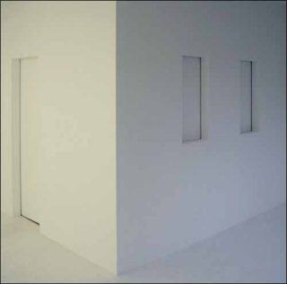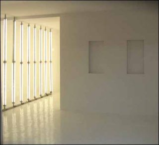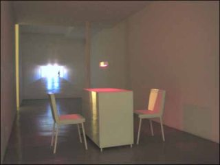 — E(N)TRE, 2005. Installation. Cloisons dimensions variables, 2 portes, 2 fenêtres, 1 projection DVD, 1 bureau 78,5 x 98,5 x 49 cm, 2 chaises 77,5 x 38 x 40 cm 1 suspension lumineuse, 9 barres de 4 tubes de fluo.