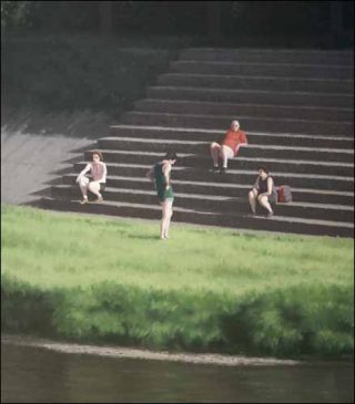 Un quatuor d’individus en short assis sur des marches en bordure d’un cours d’eau : une part de l’herbe accroche la lumière mais, tout le tableau est maintenu dans l’ombre comme si un nuage planait au dessus de leurs têtes. Les artistes préfèrent les colonnes de fumée en rase campagne, les chemins boueux lavés par les intempéries au portrait d’humains.