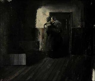 Ici, un couple s’éloigne dans un paysage qui l’écrase. Là , un homme (un soldat ?) a le visage déformé alors qu’il en approche sa main, comme si le corps à corps nuisait à la visibilité des lignes. Quand la nuit mord sur le jour, la vue se bruille, comme la peinture de ses trois artistes de talent.