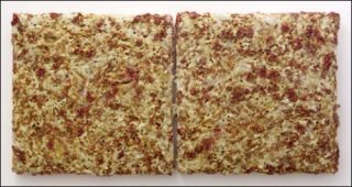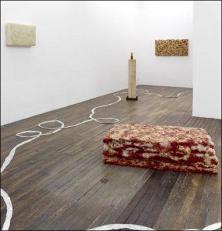 — Michel Blazy, Lasagne al forno, 2012. Colle papier peint, polystyrène extrudé, eau, colorants alimentaires, arômes artificiels saveurs pizzas fromage fondu. 30 x 117x 63 cm