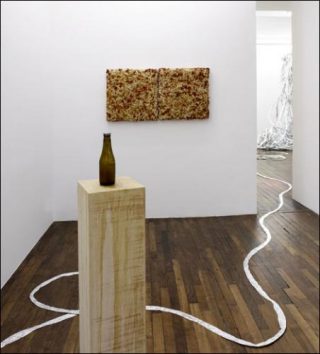 — Michel Blazy, Fontaine, 2012. Bière en bouteille, socle en bois. 18,5 x 6 cm 110 x 20,5 x 20 cm