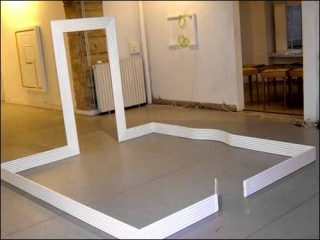 1. «L’intuition sans concept est aveugle». Je ne peux pas voir cela comme rien. Constamment, notre esprit classifie. Un fil par terre suffit pour délimiter un espace, deux fils font une porte. C’était la leçon des sculptures de Fred Sandback. La plus grande des œuvres exposées ici (S’installer, 2005) en est clairement tributaire. Le pur regard esthétique, réservé à l’art, est un mythe, ou au moins une abstraction.