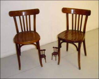 Il faut regarder de près pour voir que ce ne sont pas deux chaises, mais quatre. A un pied de chacune des grandes est accroché une petite chaise, de forme identique, mais minuscule. Pour qui sont-elles, ces chaises-là? Quels sont les êtres légers qui pourraient y prendre place?