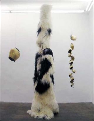 Ensuite, l’artiste a décidé d’approfondir cette idée d’Ubuah et de la ré-européaniser en y intégrant de semblables évocations des traditions folkloriques et rituelles européennes. Cela a d’abord donné lieu à l’exposition «Divorced» à la Poor Farm Experiment dans le Wisconsin, puis un peu plus tard à une autre version, la performance Hex Ubu, à la Kunsthall d’Oslo en Norvège et aujourd’hui «Defaced», à la Galerie Patricia Dorfmann, dernière étape de cette exploration des pelages et plumages visant à créer quelques personnages hybrides hésitant entre sculpture, costume et action.