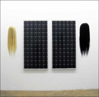 Les éléments qui ne sont pas intervenus dans une action sont les panneaux solaires et les deux têtes chevelues. Ce sont des œuvres rétinales plus classiques, les panneaux solaires notamment pouvant passer pour un essai actuel de monochrome de science-fiction façon Ad Reinhardt ou pour un austère tableau structurel. La technologie évoquée par les panneaux solaires est une base essentielle pour les satellites en orbite; sans ces cellules en silicium mono-cristallin, pas d’électricité pour les appareils dans l’espace. Dès lors, on peut aussi y voir un satellite en pièces détachées ou les composants d’un futur engin.