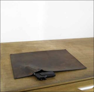 — Série «Holster/bureau», 2006. Gaufrage d’une arme sur cuir. 49 x 60 cm.