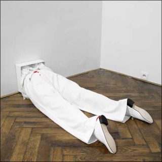 — Lyndon, 2006. Mannequin en scotch, pantalon brodé, accessoires. 120 x 45 x 25 cm.