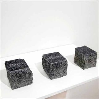 — Funérailles, 2006. 3 pavés de granit gris, sciés, polis et gravés. 8 x 8 x 8 cm.