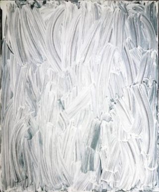 Avant la sortie de route, pour clore une rétrospective qui ne dit pas son nom, la première œuvre de 1969: une photographie noir et blanc d’un mur de pierre presque totalement couvert d’une vigne vierge au sombre feuillage, barré d’un segment de ligne blanche, que forme une suite d’une dizaine de feuilles peintes. Premier acte d’un artiste qui en surjouant un geste pictural pris au pied de lettre a aboli le recul d’un regard introspectif ou surplombant, inventé une poétique de l’ordinaire, qui plonge résolument l’art dans la vie, et inversement.