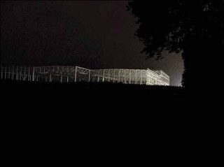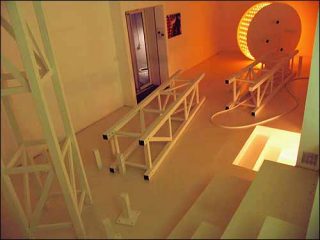 Pour sa première exposition à la galerie Aline Vidal, Stéphane Thidet propose dès le pas de la porte une vision de fin du monde. Barrant l’entrée, des structures métalliques gisent sur le plancher, à côté d’un large objet rond orné d’ampoules, comme un élément de manège. L’ensemble, intitulé Rêve de tour (2006) semble avoir été prélevé dans une fête foraine et laissé là , à l’abandon, comme le souvenir d’une fête finie.